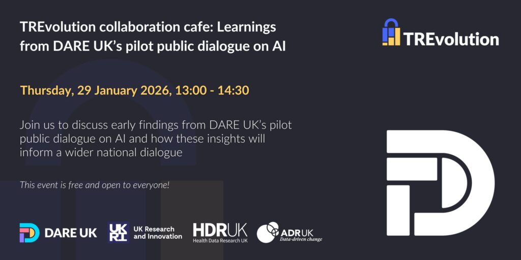 This session will look at how Artificial Intelligence (AI) is being introduced and used in TREs, share the initial findings from DARE UK’s Pilot Public Dialogue on AI and develop the focus of their wider Public Dialogue on AI, which will take place UK-wide over the course of 2026.